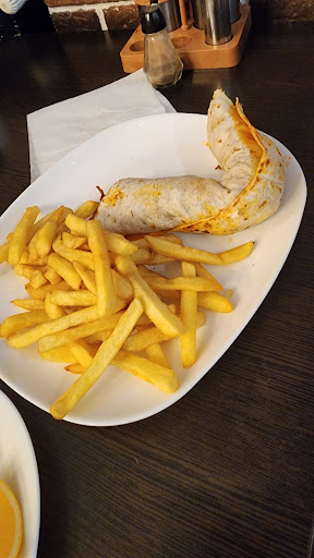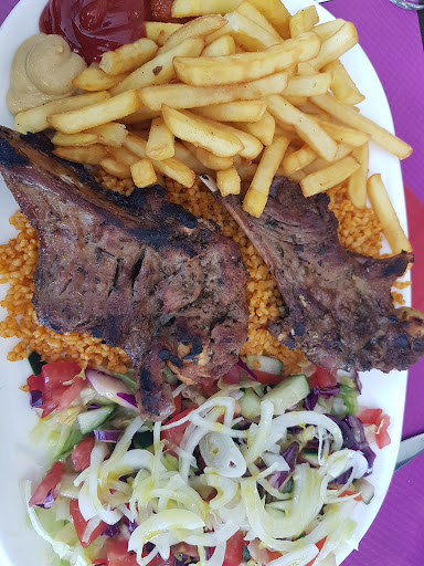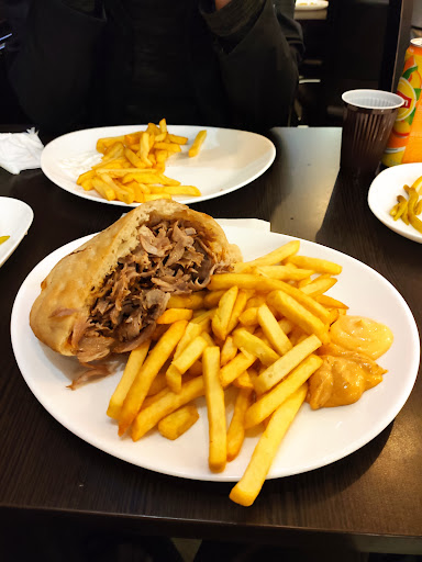 Sandwich super bon a base de viande de boeuf mariné, épices sumac, ... servi avec des frites et sur le coté une assiette de piments au vinaigre. Les frites par contre sont surgelés mais restent passable.