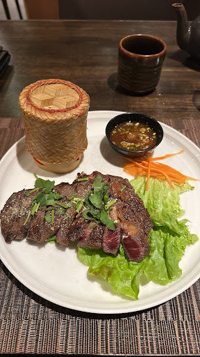 Read moreUn peu dans le doute en ce qui concerne ce restaurant. Je pense qu'une visite supplémentaire sera nécessaire. L'entrée pour 2 était très bonne, le riz frit très intéressant et tout à fait nouveau pour moi, les nems sont bien croustillants aux saveurs de mon enfance, la brochette de poulet avec sa sauce à la cacahuète est bonne. Le plat principal 'Les larmes du tigre' composé d'une entrecôte et de riz gluant était succulent, la sauce qui l'accompagnait aussi, à 21€, c'est compréhensible. En revanche, en ce qui concerne le deuxième plat principal qui arrive dans une moitié d'ananas, il est forcément plaisant à l'oeil mais il ne m'a vraiment pas plu. Il est composé de riz et il faut chercher les 5 crevettes et quelques petits bout d'ananas qui se battent en duel dans cet amas de riz, tout cela pour 19€ !!! Je trouve cette somme faramineuse pour les ingrédients qui se trouvent dans ce plat somme toute un peu grossier. Je le déconseille vivement. Les bouts d'ananas que je convoitais, ainsi que mes crevettes, se trouvaient tous dans la salade crevettes ananas de ma voisine de table... Grosse déception ! Quant au dessert, un flan coco, il me semble aussi que le tarif de 8€ est un peu élevé, 6€ serait plus juste à mon avis. Le thé au jasmin était de bonne qualité, disposé et servi dans un sachet individuel. L'accueil est très agréable, la serveuse et le serveur sont très aimables et professionnels. L'ambiance est feutrée, on se sent bien et cosy. Le bémol sera donc le tarif exorbitant et la déception sur le deuxième...