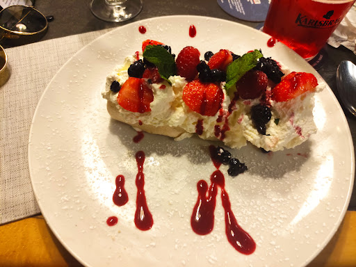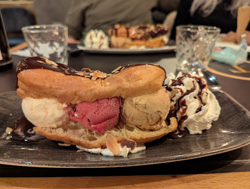 Service from our server and busser was friendly and warm. Menu included French, German, and English descriptions. Food choices include some classic “grandma’s French dishes,” and we opted for the veal’s head, which was tender, gelatinous, and succulent, and the beef cheek, which was made bœuf bourguignon style, stewed slow and low with pearled onions and a delicious wine sauce. Solid preparation for both, not mind blowing flavors, but excellent execution on classics. The staff also allowed us to swap out the ice creams sandwiched within our profiterole for dessert. For cocktails, we enjoyed their drinks made with mirabelle vodka, which came with the tiny plums themselves from the local area and were delicious, even if a bit too sweet for our preference.