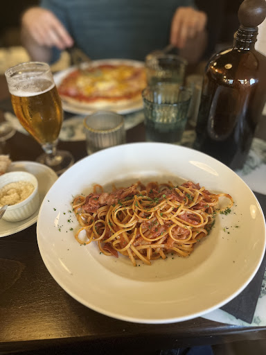 Read moreLe cadre est trĂšs agrĂ©able, la dĂ©co soignĂ©e, on s'y sent immĂ©diatement bien. Nous sommes arrivĂ©s Ă 3 personnes pour 19h30 et c'Ă©tait relativement calme. Un grand groupe Ă©tait dĂ©jĂ prĂ©sent Ă l'autre extrĂ©mitĂ© du restaurant. Un deuxiĂšme groupe est arrivĂ©, placĂ© lui aussi Ă l'extrĂ©mitĂ© du restaurant, ce qui fait que nous sommes restĂ©s au calme et nous nous entendions parler sans problĂšme, nous n'avons pas Ă©tĂ© incommodĂ©s par le bruit comme cela peut parfois ĂȘtre le cas quand il y a des grands groupes. A notre dĂ©part Ă 21h, le restaurant Ă©tait plein. La carte est fournie, des pĂątes, des pizzas, des viandes, des entrĂ©es variĂ©es. On voit qu'un soin est apportĂ© aux choix des produits, Ă servir de la qualitĂ© (charcuterie tranchĂ©e minute par exemple). Ma fille a mangĂ© une pizza qui Ă©tait trĂšs bonne, la moitiĂ© qu'elle n'a pas mangĂ© lui a Ă©tĂ© emballĂ©e, ce sera pour midi, merci :) Mes pĂątes carbonara Ă©taient trĂšs bonnes, pas de lardons en vue Dieu soit louĂ© đ Les lasagnes de mon conjoint Ă©taient excellentes, je sais ce que je commanderai la prochaine fois ! Servies avec une petite salade verte toute fraĂźche et croquante. Service rapide et trĂšs sympathique, pain, carafe et parmesan amenĂ©s sans avoir Ă demander. Addition raisonnable, nous reviendrons avec...