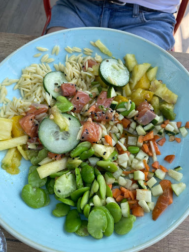 Read moreAu secours !!! J'y suis allée ce midi avec une amie, une catastrophe ! 1h pour être servies, on commande des cocktails ce ne sont pas les bons pas grave ils rectifient ça peut arriver. On commande une assiette à partager Summer Nachos descriptif que vous pouvez trouver sur le site Nachos avec différentes sauces crevettes roses, avocat, grenade, bref on nous amène une assiette remplie de Nachos avec des sauces en effet mais pas d'avocat et pas de crevettes. J'appelle le serveur très aimable je lui dis il repart avec l'assiette et revient avec quelques petits cubes d'avocats ajoutés dessus et le dit que la crevette est en dessous cachée. Avec mon amie on se regarde: la crevette ?? Mais c'est bien écrit crevettes roses au pluriel sur la carte !? Bref il y avait en effet sous la sauce du milieu une queue de crevette coupée en 4 ou 5. Ensuite les plats, mon amie commande un tataki de thon qui normalement est snacké donc bien rouge à l'intérieur (comme les photos de la carte qui sont très appétissantes) eh bien non ! Elle se retrouve avec de gros morceaux de thon gris tellement c'était cuit avec quelques feuilles de salade qui ne paraissaient pas de 1ere fraîcheur. Moi mon bowl au saumon arrive sans aucun assaisonnement, quelques morceaux de mangues ananas tous mous voir marrons par endroit et des légumes coupés en petits cubes secs qui ont dû traîner à l'air libre pas épluchés même les carottes, je joins les photos vous pourrez zoomer et constater par vous mêmes. On n'a quasiment rien mangé peur d'être malades. Le personnel de salle n'y est pour rien, le responsable a reconnu et s'est excusé et nous a fait un geste commercial mais il y a vraiment un gros boulot à faire en cuisine. Toutes les tables qui étaient autour de nous on eu...