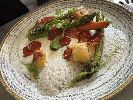 « Suprême de volaille de Moselle farci au chorizo, asperges vertes rôties, gnocchis maison et émulsion au parmesan d’alpage »
