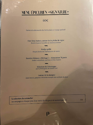 Read moreNous sommes allés manger dans ce restaurant qui, au premier abord, semblait être un bon choix. À peine arrivé on nous installe et personne ne vient nous voir pendant plus de 40 minutes. À la suite de cela on nous prend l'apéro et nous dit que quelqu'un s'occupera de nous et nous donnera les cartes. On ne sert l'apéro finalement au bout d'une heure 30 après notre arrivée et nous prend notre commande à la suite de cela. Qu'elle ne fait pas notre surprise lorsqu'on découvert que le menu épicurien doit être partagé et donc que chaque assiette est une assiette régulière à diviser en deux. Niveau quantité ce n'est pas ça... Notez tout de même que nous voulions prendre un menu et qu'il n'y avait plus de saumon gravelax, c'est possible , cela peut t'arriver cependant il a été remplacer par un tartare de thon qui nous donnait très envie, mais on nous prévient après la prise de commande que il n'y en a pas non plus et qu'on doit se rabattre sur un Paté en croûte (quand même bon). La nourriture se fait attendre. Nous mangeons 2h30 après être arrivé, à savoir 22h30, ce qui commence à faire très tard. À la suite, les autres plats se passent dans l'ensemble plutôt bien. Je ne vais pas faire tout un plat parce que le poireau n'était pas assez cuit comme seconde entrée ou que la viande ait une cuisson imposée et qui était très ferme... Enfin vint les fromages ou nous avons été servi une croûte sur laquelle on pouvait rogner un petit peu de fromage mais cela nous paraît, c'est très aberrant. Bonne note tout de même les desserts. Très bon très copieux. Après s'être un peu plein du service ils ont décidé de nous offrir seulement les cafés. Alors que les menus coûtent 55 € par personne et que rien, ni service, ni qualité de nourriture ne vaut ce prix-là.