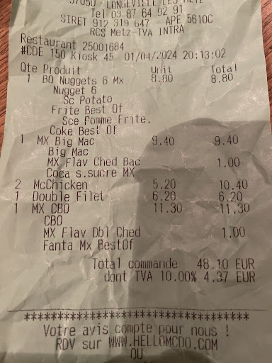 Read morePlus jamais dans ce fast-food et encore moins livré par ubereats 😡😡😡 Une commande passée à 66 €.... Et la grosse erreur de commande je reçois deux sandwichs.......😥😥😥 Donc j'appelle le McDonald's en expliquant qu'il y a une grosse erreur sur ma commande et là, il me disent qu'ils peuvent rien faire et qu'il faut que je fasse une réclamation chez ubereats 😱😱😱😱 Je leur ai demandé si c'était une grosse plaisanterie......😡😡 Donc ils m'ont proposé de faire une autre commande à 50 centime comme si j'avais pas déjà assez dépensé......😡 pour qu'il puisse me refaire la commande au bout de trois tentatives je n'ai jamais réussi à commander la sauce à 50 centimes. 😰 Résultats des courses j'ai été obligé de me déplacer à ce fast food pour pouvoir avoir enfin récupérer ma commande.....😰😱😡 Sachant que nous avons passé la commande à midi et qu'aux résultats deux heures après seulement j'ai pu avoir ma commande.... Donc je vous avoue franchement que ça m'avait coupé l'appétit......... PS: sachant que j'avais donné encore 5 € de pourboire au livreur......😡😡😡😡😡😡😡😡😡😡😡😡😡😡😡😡 Donc qui a fait l'erreur je n'en sais rien mais en tout cas ce n'est pas dû se passer comme ça moi je n'y étais pour rien..... À bon...