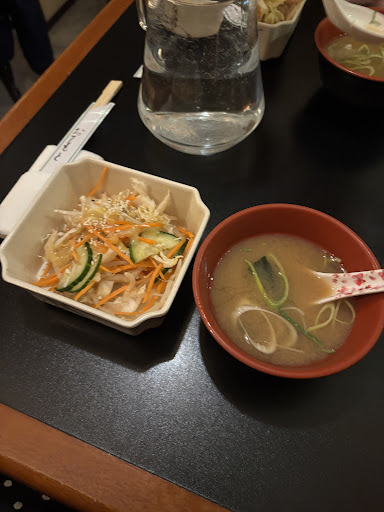 Je suis mitigĂ©e Salade de choux et soupe miso excellentes par rapport Ă dâautres japonais. Ici on sent le goĂ»t du tofu et câest vraiment savoureux. Pour le plat jâai pris un bento đ± pensant mâimmerger dans la culture traditionnelle etc, au final câest pas trĂšs copieux, beaucoup de riz. Dâailleurs jâai retrouvĂ© 1/2 mimi dans le riz đ« Brochettes vraiment pas bonnes trĂšs sĂšches et avec un goĂ»t difficile Ă dĂ©crire. Gioza trĂšs bons. Saumon de bonne qualitĂ© avec un bon goĂ»t aussi. 21⏠pour ça, encore une fois comparĂ© Ă la concurrence câest beaucoup. Je nâaurai rien soulignĂ© si les brochettes avaient Ă©tĂ© bonnes par exemple mais la câest trop