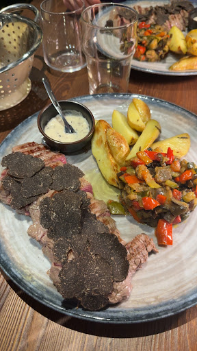 Le plat de bĆuf Ă la truffe mĂ©rite Ă peine 1/5 : une viande de mauvaise qualitĂ©, pleine de nerfs et impossible Ă mĂącher. Encore une fois, la truffe nâavait aucun goĂ»t, ce qui, au vu du prix, est vraiment frustrant. Quant aux accompagnements, ils Ă©taient inutiles : pommes de terre pas assez cuites, ratatouille immangeable. Câest trĂšs rare que je laisse mon assiette pleine au restaurant, mais cette fois, câĂ©tait inĂ©vitable.