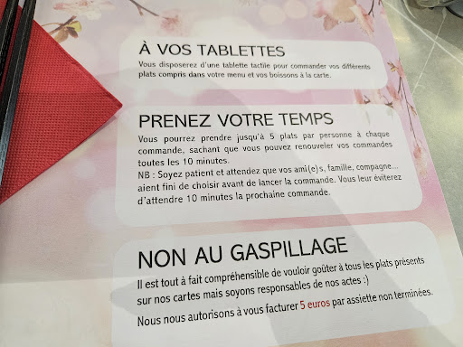 Read moreJe viens d'aller chercher a emporter pour tester ce resto car j'ai l'habitude d'aller à l'autre resto chinois à 150m à côté du Leroymerlin depuis longtemps mais je voulais tester pr comparer.Ba comme on dit ''il fo être pris pour apprendre!!" Car dès notre arrivée avant M de commander à manger on a voulu boire une bière avec mon ami et il a voulu reprendre une deuxième bière pelfort à la tireuse ( 4€ le demi !!)ils se st trompé de bière et on servi une bière qu'il n'aime pas et j'ai dû lui repayer 3eme bière car la barmaid n'a pas voulu nous échanger la bière malgré l'erreur de leur part!!! Ensuite je regarde la carte et choisi des trucs à emporter suivant les photos.sur les photos on voit des belles brochettes de poulet yakitori avec des gros morceaux de filets de poulet et pr les nems pareils on y voit des beaux nems de belles tailles donc on se dit que vu le prix ça paraît un peu cher mais si c'est des beaux produits de bonnes qualités ça passera. QUELLE surprise une fois ds la voiture qd on ouvre les barquettes à emporter !!!!! On se retrouve avec 2 minuscules brochettes de poulet yakitori faites de mauvais morceaux de poulet !!! Pareil pour les nems je prends 4nems aux crevettes pr 5e DC je m'attendais à avoir des beaux nems de qualité mais quelle déception de voir 4 minuscules nems de mauvaise qualité,on constate immédiatement qu'ils ne servent que du congelé de mauvaise qualité en plus !!!! Je n'ai jamais eu autant l'impression de me fr voler !!! Il n'y a pas photo il faut absolument aller au restaurant chinois qui est a 150m en face juste au dessus du Leroy Merlin !!!! Vous en aurez beaucoup plus pour le m prix et de bien meilleure qualité !!!! Ce restaurant est à fuir sans...