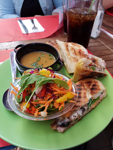 Read moreNous sommmes arrivés complètement par hasard dans ce restaurant, sans aucun a priori, et nous avons passé moment magique. L'accueil fut chalereux, dans une salle dont la décoration pleine de peps et de sincérité préfigurait ce qui serait servi dans nos assiettes un instant plus tard. Le panini était savoureux et léger, servi avec des accompagnements, potage et salade, qui avaient été eux aussi préparés avec soin. La palme revient malgré tout à la salade, magnifique, incroyablement riche d'ingrédients, qui de toute évidence avait nécessité un travail de préparation particulièrement conséquent, et qui était équilibrée, savoureuse et..... énorme!!. Si on ajoute à tout ça que le carte, pléthorique, permet de satisfaire les goûts des plus difficiles, ainsi que ceux des enfants, et que les prix pratiqués sont très doux, n'hésitez plus à abandonner le viaduc et à faire une pause à Millau dans ce restaurant qui pourrait donner des leçons d'authenticité culinaire à beaucoup de brasseries et à bien d'autres établissements plus...