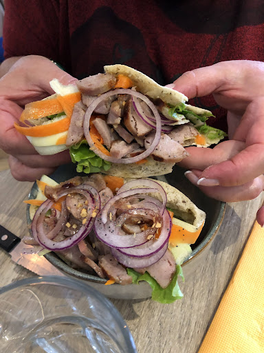 Pas de carte (à priori) mais une simple ardoise : pita avec deux garnitures au choix / potages / plat du jour / dessert. Simple et en concordance avec le fait maison et les produits frais. Explications claires et données avec passion.