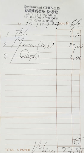 Read moreImmangeable, du rĂ©chauffĂ©, juste 2 personnes en civil,avec la femme qui sort de temps en temps d'une piĂšce qui doit faire office de "cuisine", sans tablier ni charlotte. Soupe asperges crabe qui n'est qu'un bouillon avec des morceaux de surimi et quelques asperges. Pas de riz cantonnais si vous ne le commandez pas en dĂ©but de repas soit disant trop long Ă prĂ©parer ! Du bĆuf qui a une odeur douteuse et du poulet au gingembre encore rose car le sachet qui a surement Ă©tĂ© ouvert, n'a pas Ă©tĂ© rĂ©chauffĂ© assez longtemps pour finir de cuire... le meilleur reste la salade de fruits en boĂźte... Ă fuir absolument, c'est une honte ce n'est pas un restaurant, ce sont 2 particuliers qui rĂ©chauffent des plats tout prĂ©parĂ©s et de trĂšs...