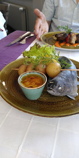 Das Essen war sehr gut. Vegetarier haben es natürlich im Elsass etwas schwerer, aber das muss einem klar sein. Das Kalbsbries war ein Gedicht und auch die Vorspeisen und Dessert waren sehr gut. Statt einer Menükarte gab es eine Staffette mit einer handgeschriebenen Tafel (die Gerichte werden vermutlich immer nach aktueller saisonaler Verfügbarkeit kreiert), diese wurde je eingetroffenem Gast am Tisch aufgestellt und man konnte die Gerichte auswählen. Wenn man bspw. aus dem grenznahen Deutschland kommt und kein Französisch kann, hilft der sehr gute Service auf Elsässer Deutsch weiter und erklärt Gerichte, wobei viele vom Namen her bekannt sind. Trotzdem könnte ich mir vorstellen, dass eine "Backup"-Menükarte (keine ganze Tafel 😃) auf Englisch oder Deutsch bestimmt hilfreich wäre.