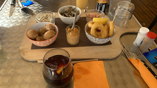 Tarifs : une planche Ă partager (20âŹ) + 1 jus dâorange, 1 diabolo, 1 sangria + 2 plats (moules et ribs de porcs) + 3 desserts (dont une glace emballĂ©e) = 80⏠(2 adultes + enfant qui a mangĂ© dans nos assiettes)