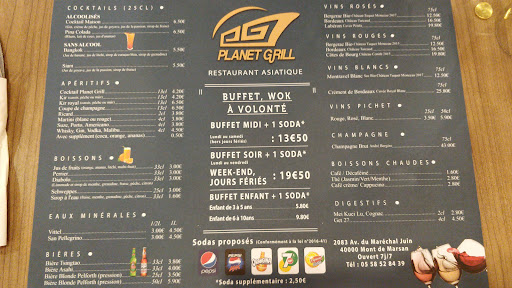 L'ancien Buffalo Grill a été repris courant 2019. Planet Grill propose une formule de repas à volonté pour à peine moins de 20 euros, avec un soda offert et eau gratuite. Les autres boissons sont en plus. L'accueil est souriant et correct. Le restaurant est propre ainsi que les toilettes. Une fois installés, on va se servir parmi les plats proposés. Une gamme d'aliments crus est présente afin de les faire cuire au wok par le chef (j'avoue avoir été bien impressionné par sa prestation). Parmi les plats, on trouve de tout, il n'y a donc pas que de l'asiatique, mais aussi des choses simples (voir mes photos). Concernant la partie desserts, il y a beaucoup de choix (j'avoue avoir été étonné de trouver des cannelés...! Pas très bons à mon goût.) J'ai bien aimé les nougats durs. Pour boire nous avions commandé deux bouteilles de vin. Il y a eu une erreur au service. Une bouteille plus chère nous a été ouverte. Mais nous l'avons payé au prix de notre commande (donc moins cher).