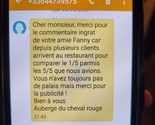 "Vous n'avez pas de palais" Voilà ce qui nous a été répondu lorsqu'au moment de payer, et après l'insistance de la patronne à avoir notre ressenti sur la cuisine, l'un de nous a expliqué que les rognons accompagnés de sauce tartare ce n'était pas son truc. Elle nous avait déjà mis dans l'ambiance à l'arrivée: quand on a demandé pour la terrasse ombragée, elle s'est mise à se justifier toute seule sur les 40°C qu'il faisait sur la terrasse, mais en parlant tellement fort que toute la salle a pu profiter de la leçon de morale. Le repas s'est bien passé, les plats sont bien présentés, les serveuses efficaces. En revanche, je n'ai pas compris pourquoi appater le client avec l'ardoise extérieure qui affiche un menu "Galette" pour finalement ne pas le proposer à l'intérieur. Si vous ne le servez pas certains jours, effacez-le. En résumé, baillonnez la patronne et tout sera parfait. EDIT : Vexée par cet avis, la patronne a récupéré le numéro de téléphone qu'on avait utilisé pour la réservation pour insulter la personne qui nous avait invité ... La classe a l'état pur...