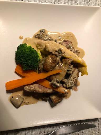 Le plat de résistance, un poulet tendre à souhait, était un modèle de cuisson maîtrisée. Accompagné de légumes de saison parfaitement travaillés, il offrait un mariage de saveurs réconfortantes et de finesse. La sauce qui l’accompagnait était à tomber, rehaussant l’ensemble avec une touche gourmande et parfaitement dosée.