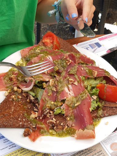 Read moreDe passage à Saint-Antonin-Noble-Val. 20mn d'attente pour prendre place à table. Personnel au minimum de l'amabilité. 40mn d'attente pour se faire servir 2 crêpes. Temps d'attente justifié par le fait que l'équipe en cuisine était exceptionnellement en sous-effectif. Néanmoins, les crêpes étaient bien copieuses -photos ci-jointes- et vraiment délicieuses (il s'agissait des 2 spécialités du Quercy). Seulement, une sauterelle s'était incrustée sous la salade -photo ci-jointe-. Je justifie mes 2 étoiles, la première par l'amabilité du patron qui s'est excusé de l'incident en amortissant le prix final. La deuxième, par la réelle qualité des crêpes et leur...