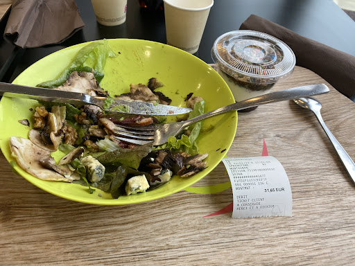 Commençons par l'intérieur ,c'est un self avec beaucoup de monde, beaucoup de bruit, on vous propose un menu salade tout fait ou vous pouvez composer votre propre salade, au niveau du goût pas de problème plutôt goûteux et assiette assez bien remplie, Par contre le prix et essesif (voir photos) ,une salade poulet , une mini bouteille d'eau, et une salade de fruits, 17 €, je n'ai pas osé prendre un café . Attention pour ce prix personne ne vous sert à table et en plus c'est vous qui devez débarrasser votre table. Je ne remets pas en cause la qualité des produits, mais uniquement le prix ,en effet dans un prix il y a la qualité des produits mais aussi du service . Clairement ce n'est pas un lieu où j'irai manger tous les midis hors budget.
