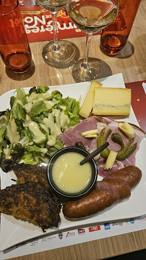 Assiette Franc-Comtoise 19€ : Salade, saucisse de Montbéliard, jambon à l’os, galette de pommes de terre, assortiment de fromages de la fromagerie de Montbéliard. Très copieuse et parfaite pour découvrir toutes les spécialités de la région. Comptez 20min d’attente