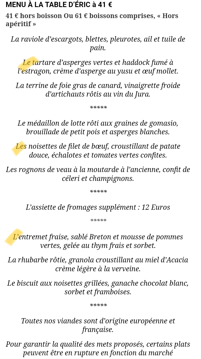 Read moreLe meilleur restaurant de la région a rouvert ses portes pour notre plus grand bonheur. Avec sa rénovation, la cuisine a gardé son tonus et sa fraicheur. Le chef Eric, compose des plats délicieux et raffinés. Pour fêter mon anniversaire, nous avions choisi le menu confidentiel composé de deux entrées, 1 plat et un dessert au prix de 58€. Tout était parfaitement réalisé. La soupe d'endives à la mousse de cèpes, en mise en bouche, avait ce léger goût d'amertume comme on aime. Au menu surprise, nous avons dégusté des langoustines suivies de coquilles Saint-Jacques avant la pièce de veau, tous, idéalement préparés et servis de légumes juste cuits à la perfection. Le dessert léger, aérien, parfumé et accompagné de son petit verre de rhum était "à tomber". Un soufflé dans la pure tradition! Nous avons aussi apprécié la mini tarte citron-framboise, la crème au café et la crème brûlée à la sauge pour les mignardises. Les vins et le champagne étaient à prix très abordables. Un vrai plaisir gastronomique et...