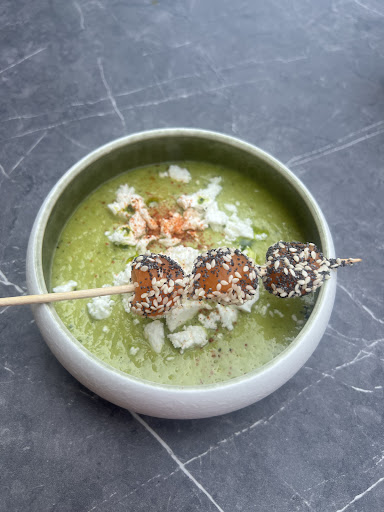 Nous avons commandé un apéritif et notre repas. Le choix était limité, ce qui, à mon avis, signifie des produits frais, un bon présage en général. Le cocktail ‘KAMILLE’ était excellent, mais à peine servi que l'entrée est arrivée après seulement 30 secondes. Il n'y avait donc pas vraiment le temps de savourer ce bon cocktail. Nous avions plutôt l'impression que l'on ne venait pas ici pour passer la soirée, mais pour manger rapidement et partir aussitôt.