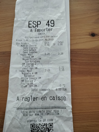 Read moreJ'ai voulu commander au drive aujourd'hui le 17 janvier 2025 et c'est impressionnant de voir qu'après toutes ces années où l'on leur a reprocher certaines choses , les personnes travaillant cher Macdonald ( pas tous bien évidemment ) n'en font qu'à leur tête ... comme à mon habitude je suis aller à la borne et à ma grande surprise, moi qui penser que Macdonald était un " fast-food " la personne répondant à la borne n'a mit pas moins de 15 minutes avant de parler dans l'interphone sans même dire bonjour .. et par dessus le marché je rentre cher moi pour finalement manger mon repas et en voulant remettre le dessus de mon Burger ( 280 ) je me rend compte qu'il y a un morceau de salade dedant ... ce qui n'est pas sencer se produire étant donné que dans la " recette " de celui ci il n'y en a pas .. certes on pourrait dire " ce n'est rien , mais si j'étais allergique à ce produit , cela aurai pu créer une réaction ce qui n'est pas sencer ce produire si le Burger avez était correctement fait . Je sais que ce n'est pas ma personne et le peu de commande que je fais dans ce " restaurant " qui changerons leur chiffre d'affaire mais je ne retournerais certainement plus la bas ... et je ne leur ferai sûrement pas une très bonne pub auprès de mes amis et proche . Merci d'avance aux personne qui auront le courage de lire...