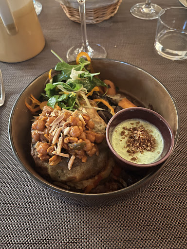 Read moreTrès jolie cadre Ils font des plats adaptés aux personnes qui doivent manger sans gluten et veggie. Belle présentation des plats mais attention il faut compter un supplément (d'environs 3 euros) quasi sûr chaques plats en plus du menu de base. Très gros bémol le service est très très long (arrivé à 12h30 sorti à 15h pour 4 personnes sans prendre de dessert!) Et le restaurant était très loin...