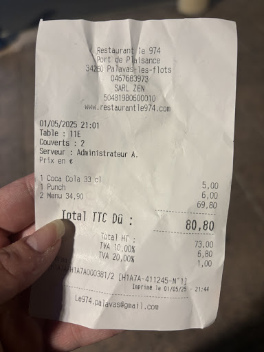 Read moreAucun accueil une attente un peu longue pour avoir notre commande pour au final avoir un serveur pas agréable du tout avec aucun respect... Je venais pour faire loisir à mon conjoint nous avons préférer partir sans manger que d'être servis par cette personne qui manque de respect aux clients... Nous venions avec le "midi pass" qui propose un menu acheté un offert peut être que pour MONSIEUR nous ne somme pas des super clients mais ce coupons est fait pour découvrir des restaurants proches de chez nous pour y revenir à l'occasion mais la trop déçu... Puis une menu à 22.90 sans choix je suis restée très étonnée aussi la plupart des restaurants il y a le choix avec 2 entrées 2 plats 2 desserts chez 974 non c'est 1entree 1 plat 1 dessert aucun choix!!!! Je déconseille fortement le restaurant 974 aucun accueil ni respect et la décoration est loin de lois faire voyager...