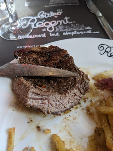 Points négatifs, malheureusement il y en a un peu plus: Le restaurant est pas propre, les murs ont des éclaboussures, le sol est sale et collant, certaines tables sont bancales et d'autre sont calées avec de l'essuie tout. Les toilettes ou plutôt le placard foure tout, très loin d'être propre, honnêtement on se serait cru dans un fast food et même certains fast food sont plus propre, avec des serveurs en tenue coordonnés là ce n'est pas le cas, étonnant pour une enseigne nationale 🤔 Le principe du réchaud ? Et bien on ne le connaîtra pas , puisque ce n'est pas expliqué et on nous a posé les frites dessus. Les plats ne sont pas digne d'un bistrot surtout en ce qui concerne la quantité au niveau de la viande. Les plats sont un peu trop poivré, est ce que cela vient de la fameuse sauce ? Les ruptures de produits ne sont pas annoncé avant et le serveur ( peut être débutant) ne nous a pas proposé de vin. La serveuse qui a servi la table de derrière ne connaissait pas sont accords mets et vins non plus car ses clients lui ont demandé conseils. Au moment du dessert, nous avons redemandé de l'eau mais on nous en a pas redonné. On ne nous propose pas non plus de café, c'est dommage. Je suis persuadé qu'en revoyant tout ces petits détails ça donnerait envie d'y retourner. Au moment de régler l'addition, nous avons été au bar de nous même et franchement l'état du bar donne pas du tout envie de revenir: du sucre, des morceaux de citron et du gâteau grand mère dans une assiette qui traînent un peu partout au bar. Vraiment...