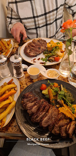 Nous avons pris : Carpaccio de Boeuf (20âŹ) : Le fromage italien a Ă©tĂ© une belle dĂ©couverte Terrine de Foie gras mi-cuit (24âŹ) : Fervente du sucrĂ©/salĂ©, j'ai Ă©tĂ© conquise. Le seul conseil a donner, rajoutez plus de toasts, c'est sacrĂ©ment bon ! Black Beef Cheese pour 3 (150âŹ) : Un vĂ©ritable spectacle nous avons eu de la part du cuisinier faisant la dĂ©coupe et la cuisson devant nous. Les diffĂ©rentes cuissons ont Ă©tĂ© respectĂ©es ! Nous avons pu choisir 4 sels diffĂ©rents, 3 accompagnements au choix ainsi que plusieurs sauces. Le plat Ă©tait joliment prĂ©sentĂ©, les lĂ©gumes en accompagnement Ă©taient bien croquants comme souhaitĂ©. La purĂ©e de pomme de terre a Ă©tĂ© mon petit coup de coeur parmi eux ! La viande Ă©tait tendre, il n'y avait pas de nerf contre qui se battre, d'une facilitĂ© Ă dĂ©couper jamais vu ! Terre et Mer (59âŹ) : La viande Ă©tait bonne, malheureusement les gambas Ă©taient lĂ©gĂšrement trop cuites. Une petite dĂ©ception Ă©galement sur la chiffonnade, les morceaux me semblait plus Ă©pais
