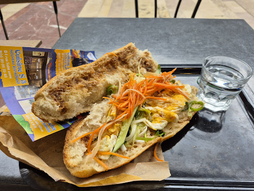 J'ai testĂ© : Not for me ! J'ai demandĂ© un banh mi poulet. On me sert un banh mi omelette (Je le fais savoir. Un problĂšme de langue ? Mais je le garde, il ne faut pas faire le difficile). Si le pain semble gĂ©nĂ©reux, le contenu est plus que lĂ©ger (v. photo). L'Ćuf Ă©crasĂ© - ce n'est pas une omelette -, semble Ă©talĂ© comme pour combler le vide entre les rares lĂ©gumes. Pour 7 ⏠payĂ©s, je vous laisse deviner le bĂ©nef rĂ©alisĂ©. Et je ne parle pas des 3 gamins, certes mignons, qui jouent, crient, et passent presque entre vos jambes. Sans s'excuser. Une pause-collation pas trĂšs rĂ©ussie donc.