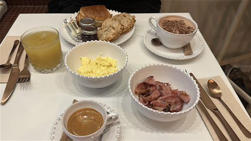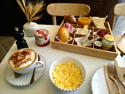 Read moreÀ 5 minutes à pieds de la gare, on trouve ca café-brunch agréable, à l'ambiance chaleureuse et accueillante. Carte assez fournie, on y est bien reçu ! La nourriture n'a rien de gastronomique ni d'expérimental, c'est un petit-déjeuner et/ou brunch typique, avec des produits que nous connaissons tous (œufs, jambon, jambon de parme, fromages, madeleines, viennoieseries, etc), ce n'est pas une critique dans ce cas mais un bon point, ça comforte dans l'ambiance relaxante du matin. Toutes sortes de cafés et autres boissons, et des options pour un déjeuner plus copieux si vous venez plus tard. De mon point de vue un poil cher, mais rien d'excessif; et je ne viens pas des grandes villes, probablement standard à Montpellier. Seul point négatif, et ils n'y sont pour rien, la climatisation du voisin qui leur fait face est vraiment bruyante, pour un matin relaxant mieux se placer à l'intérieur (où on ne l'entendra plus du tout), mais c'est un peu dommage. Mais ça n'enlève à l'accueil et à la prestation que j'ai apprécié, si je repasse le matin en train je saurai...