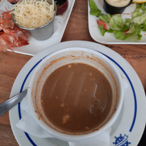 Jag vet inte hur jag ska formulera detta besök egentligen...det var nämligen en helt ovärdig måltid. Hade längtat efter fisksoppa och såg att det fanns på menyn. Glada i hågen klev vi in, hittade ett bord nära utgången och fick våra menyer. Eftersom vi redan visste vad vi ville ha så behövde vi inte någon tid alls att fundera. Vi fick vårt vita vin och personalen kom med varsin sked till oss och även servetter. Några minuter senare anlände även kniv och gaffel. Aha...tänkte vi det blir någon typ av bouillabaise. Då blir det nog gott!! Snart kom servitrisen med två tallrikar buljong som ställdes framför våra hungriga blickar. Vi började inte måltiden för det skulle väl komma fisk också. Inget hände! När vi fick ögonkontakt med personalen frågade vi om vi inte skulle få någon fisk. "Det är fisk i" blev svaret. "Den är mixad". "Men vad ska vi ha kniv och gaffel till"? frågade vi. "Det ingår i kuvertet" blev svaret. Där satt vi med varsin tallrik tråkig grumlig buljong som alltså innehöll "mixad fisk". Som tillbehör fick vi brödkrutonger, riven ost och något vitlöksaktigt liknande majonnäs. Vi surnade till och ville beställa något matigt att komplettera måltiden med, ex vis fisk. Då ställde man ett stålstativ framför våra ögon, ett som det brukar serveras skaldjursplatå på. Efter ytterligare några minuter hämtades stativet från bordet. Sen hände inget på en stund...Några minuter...sen kom man in med ett fat med sex jätteräkor, tre vardera och lite sallad. Vi började skala räkorna och adderade dessa till buljongen. Vid det laget hade "soppan" börjat kallna. Hursomhelst smakade den bara beskt av något som verkade vara romkorn som sjunkit till botten i tallriken. Vi kunde inte äta upp utan bad att få notan. Denna lät vänta på sig trots att personalen kom förbi vårt bord flera gånger. Mitt sällskaps tallrik plockades ut men inte min. Efter en stund ytterligare kom servitrisen mot vårt håll och råkade se att min tallrik stod kvar. Hon tvärvände då och återkom sen med vår nota. Vi fick ingen som helst kompensation och räkorna kostade 14 €, buljongen kostade 12€ per person. Ingen fråga om det till slut smakade bra, ingenting. Jag, som bara en gång tidigare i livet klagat på restaurangmat berättade att "detta var inte gott", "detta var ingen fisksoppa. Vi fick ingen förståelse alls av personalen, men vi betalade och gick. Kanske är det så här man lagar fisksoppa i denna trakt, isåfall har vi missförstått det hela. I vilket fall som helst så smakade den inte...