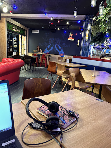 DĂšs notre arrivĂ©e, nous avons trouvĂ© le lieu sublime dans une ambiance cosy, convivial et assez atypique avec son baby foot, ses couleurs vives et il me semble une borne dâarcade.