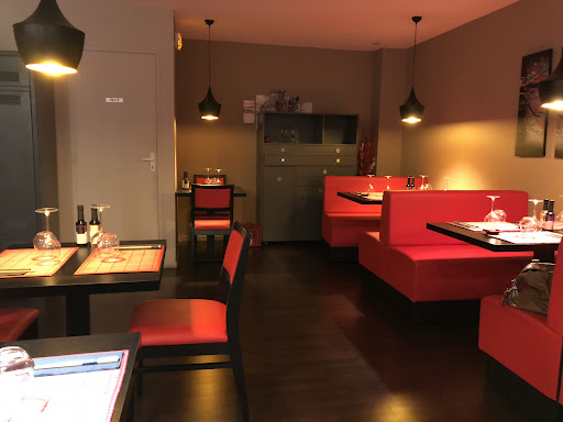 Le restaurant ne paye pas de mine vu de l'extérieur ou au rez-de-chaussée, mais il comporte un étage/mezzanine accessible par escalier, donnant sur une salle très agréable, joliment décorée en bois et rouge, aux motifs japonais.