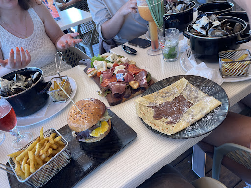 Le service. Nous sommes arrivés vers 18h pour un repas avant de quitter Palavas. Nous avons commandé pour quatre : un plateau de charcuterie et de fromage avec des frites au cheddar en entrée, 3 moules-frites, 1 burger en plat et une crêpe en dessert pour l'un de nous.