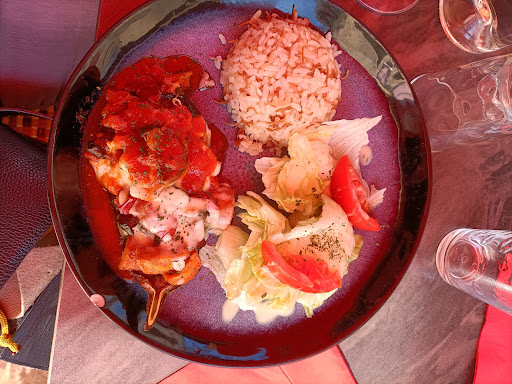 Et nos voisins de table avaient pour assiettes; Une brochette d'agneau, servie sur une fine galette et sans la broche (qui bien souvent nous complique la vie), accompagnée de frites, & salade verte tomates. L'autre assiette, une belle part de Moussaka, riz parfumé, & salade verte tomates. Cela a conforté notre opinion sur ce resto qui compte aussi une salle spacieuse à la déco orientale...