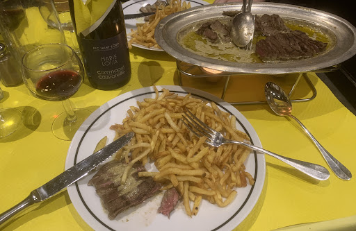 Last time visited Montpellier saw the long queue in front of this restaurant, but rush to leave the city then decided have to try when come back here again. This weekend, I did it finally. Still long waiting line even it's closed to 2PM, lucky not too long wait and got seat. Lunch menu was simple and only one classic type of steak served, saved my without struggling. Go to the point, steak was cooked and soaked in a shellow butter, served parrially on the plate with string fries at side, fries was free flow and staff refilled once a while. Steak was medium and so tender and juicy, just hit my tone, the fries very thin and soft inner with extemely crispy shell, amazing part was it not oily at all. I would say this meal was my best experence for steak and fries ever. The restaurant was not that modern style but stunning, typical old school classical feeling, ladies in restaurant slillfully served the crowd and quite friendly even busy to fly. Finally the bill was pretry reasonable, a big set of tasty steak plus a small bottle wine just costed me 34 Euro, amazing. I will miss it and find another chance to be here again to tey a dinner. Highly recommend, you...