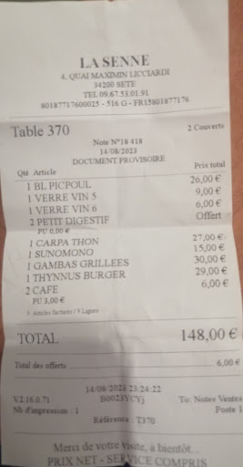 Read moreOn s'attendait, vu les bons avis du guide Michelin, à déguster une cuisine à un bon rapport qualité prix, surtout quand on est fine bouche et qu'on aime les produits de la mer. Quelle déception. Au delà du cadre agréable près du port et de la gentillesse du personnel, il est impossible d'apprécier un restaurant qui pratique des tarifs élevés et qui sert une cuisine quelconque et sans saveurs. Rien à dire sur la fraîcheur des produits : pour notre part, des couteaux, de la daurade, du thon. mais la fraîcheur ne suffit pas quand au final on se retrouve avec une facture de 140 euros pour deux personnes. Les couteaux de mer, produit rare, certes, mais baignant dans l'huile. La daurade grillée, un produit simple mais goûteux même grillé, qui nageait également dans l'huile, sans assaisonnement, avec juste quelques lamelles de courgettes et carottes sautées sans saveur, sans cette petite touche imaginative en terme d'épices et de goût qui peuvent faire d'un plat simple, un grand plat. Le tartare de thon rouge, servi avec des pommes de terre sautées, ... et rien d'autre, aucune épice, aucune sauce, aucun ingrédient pour l'agrémenter, aucune touche personnelle. Quelconque et sans goût. Le seul bon point, le ceviche de fruits de mer et de daurade, pris en entrée assaisonné de coriandre, citron, piment et tomate. On se retrouve au final à payer 140 euros pour 2 entrées et 2 plats, vin compris. Je ne recommande vraiment pas cette table à Sète. Je veux bien comprendre que les produits frais tels que les poissons sont rares et chers, mais ce n'est pas une raison pour pratiquer des prix exorbitants sans avoir en retour une cuisine imaginative et goûteuse. C'est ce qu'on attend d'un restaurant qui n'est pas à la portée de...
