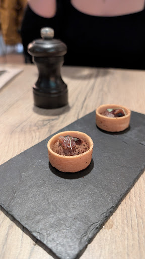Read moreGlobalement on a Ă©tait plutĂŽt déçu de l'expĂ©rience. 1ere fois dans ce restaurant recommander par un amis nous somme venu pour le repas du 31 dĂ©cembre avec le menu unique. RĂ©servation pour 19h30 pour une fin estimer vers 21h30 au plus tard. Nous avons reçu notre dessert Ă 22h20 et nous somme dĂ©pĂȘcher car dautre personne attendez pour venir manger car le service Ă pris bcp de retard... Donc le Service Ă©tais trĂšs lent surtout au dĂ©but Nous avons attendu prĂȘt de 40min pour avoirs les amuses bouche surprise. Donc nous avons manger les amuses bouche et n'arrivons pas Ă identifier ce qu'Ă©tait la mousse verte sous l'Ćuf de caille. Quand nous avons demander la serveuse n'Ă©tais pas capable de nous dire de quoi il Ă©tait composer et nous parler de cacao... Ensuite les entrĂ©es la 1ere avec le homard Ă©tait correcte la 2eme avec le foie gras plus plaisante. NĂ©anmoins il manquer quelque chose pour contre balancer le bloc de froid gras qui Ă©tait vraiment gros il manquer le sucrĂ© pour contre balancer les coins et les pommes ne jouer pas vraiment ce rĂŽle. Les plats l'assiette de poissons Ă©tait plutĂŽt dĂ©cevante c'Ă©tait plus le legume qui Ă©tait mis en valeur que le poisson donc les lĂ©gumes Ă©tait bon certes mais ce n'Ă©tais pas censĂ© ĂȘtre l'Ă©lĂ©ment mise en valeur. La viande Ă©tait bonne et les lĂ©gumes toujours aussi bon. Le dessert malheureusement Ă©tait vraiment dĂ©cevant et arriver Ă nous Ă©cĆurĂ© impossible de finir cette bĂ»che glacer tout maron sans texture ni rien payer pour une glace au maron sous forme de buche sans croquant sauf les pauvres miette de meringue Ă peine prĂ©sente...