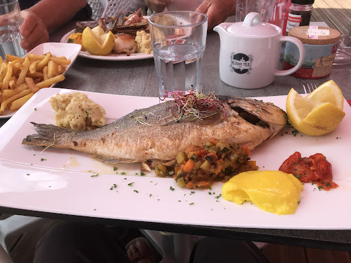 Beautiful setting overlooking the boats. Friendly, attentive service and a great menu. The portions were huge and we were able to share the parillada between two - a feast of grilled salmon, seared tuna, mussels, stick shellfish. The plate looked fabulous but the cooking was uneven, the salmon overcooked and almost cold, the tuna needed more cooking. The shell fish were dry and overcooked. The sea bass was delicious and huge so we took half the fish home in a ‘doggy bag’. The chips were well fried and the local picpoul white wine a tasty matching. The cafe liegeois dessert was delicious. Strangely, the pay counter at the end was...