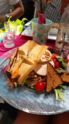 -2 morceaux de pain une petite confiture à la fraise et un petit morceau de beurre par personne et pas plus, un petit verre de jus de fruit avec des glaçons. -3 amis avaient des assiettes incomplets (petite verrine absente , morceau d'ananas oublié,...) -la charcuterie était une saucisse de 3 cm et un tranche de saucisson... donc cela donne l'impression de donner le minimum (sûrement pas voulu) un 2 e service même pour des brunchs, le restaurant mélange brunch et restaurations classiques donc pas l'esprit brunch qu'un groupe recherche pour discuter un peu après le repas. Nous avons pour habitude de rester à discuter. Mais cela n'est pas très important c'est plutôt le fait qu'une forte pluie etait entrain de tomber et que la serveuse nous propose de libérer la table et d'attendre que la pluie s'arrête debout ou de se compacter avec des clients dans la boutique debout...(en periode de Covid). Si il ne pleuvait pas nous serions parti sans aucun soucis mais nous ne souhaitions pas ni être debout, ni être mouillé (une table nous a été proposé mais nous aurions été mouillé car le parasol installé juste avant l'averse etait trop petit. Les gens en dessous on été déplacé je crois.