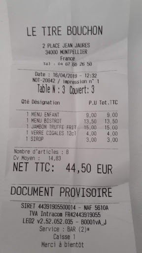 Read moreIl y a un avant et un maintenant. Avant (2015/16/17/18) repas agréable, cuisine de qualité, avec souvent une petite touche originale. Maintenant tout est décevant. Cuisine quelconque qui pourrait être tout juste acceptable pour une cafétaria de seconde zone mais pas pour un restaurant du centre de Montpellier et à ce tarif. Un poisson menu enfant servi sans aucune préparation, on peut toujours dire qu'un enfant est peut-être moins exigeant, ce n'est pas pour autant une assiette pour chien qu'on attend dans un restaurant. Entrée du jour qui ne donne aucune envie quand elle est servie et malheureusement pas bonne. Ensuite un morceau de boeuf de seconde ou troisième qualité, trop cuit, accompagné d'une sauce sans doute en poudre au départ... Un jambon truffé à 15 € dont le coût d'achat ne doit pas dépasser les 2 € auquel il faut rajouter pour être honnête 1mn de préparation consistant à le déchirer afin qu'il devienne soit disant un jambon truffé. Belle marge ! Tous ces plats accompagnés de frites décongelées, molles et pas bonnes. Enfin le clou du spectacle se passe en cuisines. Elles sont ouvertes sur la salle. Cela peut être très bien mais attention c'est parfois à double tranchant.... Et la bim... triste spectacle, on assiste à un duo de rappeurs casquettes à l'envers pas à celui de vrais cuisiniers ! Quant aux odeurs qui se mélangent toutes sans doute à cause d'une mauvaise ventilation, c'est fort désagréable. J'allais oublier, une chaise enfant traîne à côté de notre table. Si vous en avez besoin, surtout ne la demandez pas, votre enfant risquerait de se blesser avec le plastic coupé et tranchant et des restes de nourritures sèches sont parfaitement collées sur l'assise.