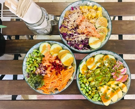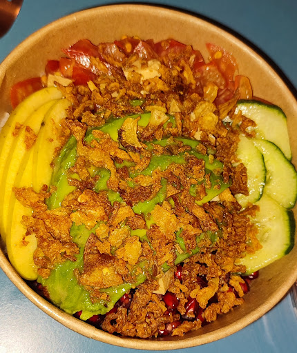 Les portions sont gĂ©nĂ©reuses, les bowls sont bons et les commandes prĂȘtes rapidement. Les ingrĂ©dients de base (4) sont en bonnes quantitĂ©s, avec un riz collant en harmonie. Le poulet est excellent, je le recommande sans hĂ©sitation. Il y a plusieurs toppings que je varie selon les envies (coriandre, cacahuĂštes, oignons fris, etc.) Pour la sauce, je prends habituellement la California sucrĂ©e comme valeur sĂ»re et je ne suis pas déçue de la Spicy mayo qui est incroyable (elle pique peu au dĂ©but, Ă©normĂ©ment Ă la fin, jâadore). Lâavocat en supplĂ©ment (1âŹ) est mĂ»r, il sâagit dâun demi avocat bien prĂ©sentĂ©. Seule ombre au tableau, la mangue en supplĂ©ment (1âŹ) nâĂ©tait malheureusement pas mĂ»re, assez dure.