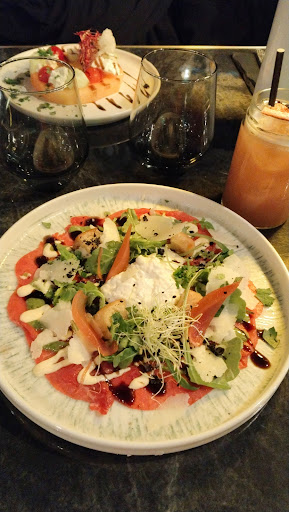 Read moreOn a ici un menu à 42€. Mosaïque de thon, choripán, en plat des pâtes en sauce pesto à la pistache et stracciatella, ou encore un cordon bleu sauce forestière. En dessert on vous proposera une assiette de fromage, un tiramisu ou la brioche perdue. A la carte, on propose des gnocchis sauce crème de truffe à 27€ le plat. Alléchant à première vue non? Néanmoins quand les entrées arrivent c'est la dégringolade. Du ketchup et de la mayo en décoration avec la mosaïque de thon?! Également avec le choripán... Faute de goût sur les entrées, ces sauces étaient visiblement de trop. Le plat de pâtes au pesto pistache n'était pas mauvais, le cordon bleu non plus (bien qu'il manquait un peu de quantité dans cette assiette). Par contre... Les gnocchis... Je me demande encore si une étape de la cuisson a été oubliée. Ils fondent dans la bouche tel un spasfon lyoc! On a une sensation de farine pas cuite en les mangeant. De plus, ce plat a embaumé nos narines d'une odeur de truffe très prononcée. Les desserts n'étaient pas mauvais, mais un peu cher. Le service était plutôt bien orchestré, et rythmé bien qu'il y ait eu une remarque un peu maladroite en début de repas. La musique est a revoir. Le niveau sonore n'est pas très bien géré, on est obligé de hausser la voix pour pouvoir s'entendre. Je trouve que cela vient gâcher les efforts qui ont été fait au niveau de la décoration intérieure du restaurant.