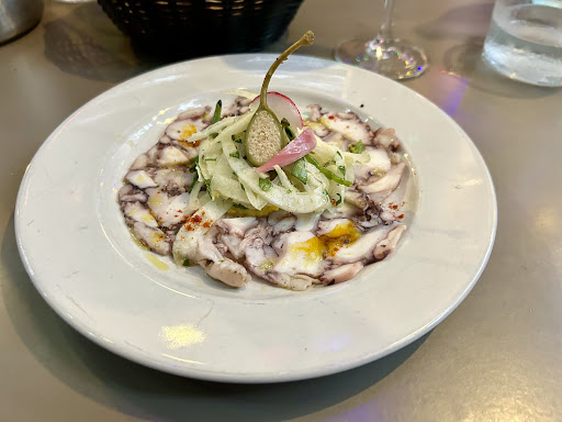 Read moreTrès décevant, a fortiori étant donnés les avis et pour une adresse bib gourmand Michelin. En entrée la tarte fine "aux tomates confites" poivrons et coppa ne contient en tout et pour tout qu'UNE tomate cerise chaude, la pâte feuilletée SI faite maison est à revoir, et je me demande encore à quoi correspondait les poivrons (pour la coppa c'est simple : il s'agissait vraiment d'une tranche simplement posée dessus). Le plat (encornets à la soubressade, risotto encre, bouillon pimenté à la poutargue) (qui semble être une des spécialités de la maison et appréciée par d'autres) m'a semblé beaucoup trop gras et sans élément venant contrebalancer cette sensation. Le prix entrée/plat 30€ pour la qualité de l'assiette semble trop élevé. Le service est lent (1h30 pour 2 temps est disproportionné). Certes le patio est un atout mais il mériterait d'être mieux entretenu. Et pour couronner le tout, pas de contrôle du pass sanitaire... Note positive tout de même : l'accueil...
