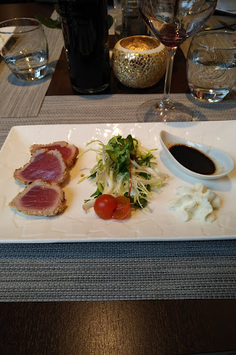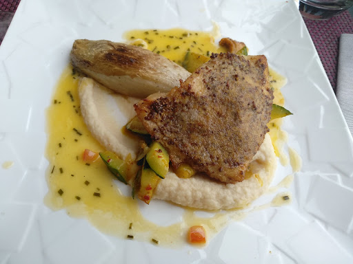 Read moreDans le village de Marseillan, au bord du port, une très belle bâtisse à l'architecture bien différente de celle des autres maisons alentour. Nous sommes six confortablement installés sur une terrasse vitrée fermée qui donne sur le port. L'accueil est chaleureux et la carte originale et diversifiée. Mon carpaccio de Saint Jacques est superbement présenté (voir photo) entouré d'une garniture de légumes vert et surmonté d'un mélange d'algue mariné. Et c'est aussi délicieux que c'est beau. Le reste des convives s'oriente vers un foie gras maison, parfaitement cuit et goûteux, ma fille penche vers un potage de potimarron agrémenté d'un peu de foie gras dans un mariage réussi. Pour les plats, outre le classique filet de bœuf, je penche pour un turbot très bien cuit et ma fille pour un loup en filets. Enfin au dessert nous nous sommes laissés tentés par une sorte de crème brûlée en croûte au Noilly Pratt ambré servi avec un verre du même breuvage. Outre le fait que ce soit délicieux, nous avons donc découvert la version ambrée du fameux vermouth. Nous avons d'ailleurs après le repas visité les caves à deux pas et avons fait l'acquisition d'un coffret de trois bouteilles dont la version ambrée et la version rouge !! Nous avons été servis par la patronne de l'établissement, aux petits soins avec nous, avenante et compétente (elle nous a conseillé des vins en totale adéquation avec nos plats). Elle a un petit accent britannique charmant et a été d'une totale gentillesse. Enfin, cerise sur le gâteau, les lieux d'aisance sont d'une propreté irréprochable et la salle derrière la terrasse...