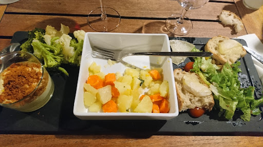 Read moreQuelle DECEPTION !! Venue un soir pour faire le pot de départ d'une amie, nous avons été de surprise en surprise et nous gardons un goût amer de cet endroit qui pourtant est capable de beaucoup mieux ! Etant nombreuses, notre amie avait juger préférable et mieux de voir le menu avec le responsable au préalable. Il nous a été proposé un repas composé de 4 planches différentes avec une planche entrée, une planche repas, une planche fromage et une planche dessert (à partager avec 4 convives à chaque fois). Les planches des entrées et du plat étant composé majoritairement de viande (charcuterie et autres), la moitié d'entre nous avons opté pour une option plus végétarienne (sans détail du menu, mais en gardant en tête l'idée des planches proposées mais en version plus veggie). 1ère surprise : pour nous placer en terrasse, 2 tables : une "végétarienne", une "viande". Simpa ! ok Covid oblige, pas plus de 10pers mais scinder autant les personnes par rapport à leur choix alimentaires c'est moyen. Après questionnement, le serveur nous explique que c'est parce que se sont des grandes planches à partager et que les deux ne sont pas mélangées. Ok, soit ! 2ème surprise (pas des moindres) : les planches arrivent sur les tables. Celles avec de la viande sont bien garnies, il ne s'agit là que de l'entrée, elles doivent se les partager en 4. Lorsque arrive nos planches végétariennes (photo ci-dessous), une seule et même planche, donc individuelle, jusque là pas de soucis. Celle-ci est composée d'une verrine avec un petit biscuit émietté au dessus (sucré, salé nous ne le savions pas encore), d'un petit plat carré avec des légumes dedans (choux-fleur, brocolis, carottes et pommes de terre) et pour finir de 2 toasts avec visiblement un morceau de chèvre fondue dessus sur quelques feuilles de salades/tomates cerises & fruits secs. Toute la tablée se questionne, s'interpelle, s'agit-il pareil d'une planche entrée ? la verrine est-elle la version salée d'un crumble (trop cool) ? Après question posée au serveur, il s'agit de notre planche repas ! celle-ci était composée de l'entrée, du plat et du dessert en même temps ! Les légumes (surgelés, et hors saisons) étaient vapeurs sans sauce, sans goûts, sans herbes, aromates ou épices (normalement servi avec de l'aïoli qui avait été oublié et amené à la casi fin de notre plat), la salade et les toasts de chèvre ça pouvait allé (bien qu'en voyant après les moitiés de cabeccou servit à la table "viande" sur chaque toast, on s'est dit qu'il y avait une petite injustice quand même), et pour finir notre fameux dessert qui n'était plus frais à la fin du repas (forcément ! en étant servit en même temps que le reste il fallait s'y attendre) donc mousse de coco et liquide très citronné dans le fond (je pense qu'initialement, le liquide dans le fond devait être un peu plus solide mais avec la chaleur et l'attente, ce n'était plus le cas.. dommage pour nous). Inutile de vous dire que nous avions finit notre assiette alors que nos collègues à l'autre table n'en été qu'à leur planche d'entrée.. et que nous avions encore "légèrement" faim après. Le serveur qui vient relever les planches d'entrée de l'autre table, demande si tout se passe bien, ce à quoi je lui répond (avec certes un peu d'amertume mais avec courtoisie malgré tout), que nous étions très déçu du contenu de la planche et des quantités proposées. Celui-ci, a eut des réponses des plus froides et déconvenables en nous disant que le menu était tel qu'il l'était, l'assiette végé de la semaine passée était différente, et en gros que si nous n'étions pas contentes nous n'avions qu'à partir.. (celui-ci est venu s'excuser par la suite de s'être énervé de la sorte et nous a ramené quelques mignardises supplémentaires pour notre dessert). A la suite de cela, nous avons commandé 3 suppléments de frites, histoire de caler un peu notre faim qui d'un bon geste commercial nous a gentiment...
