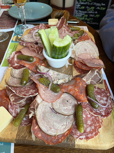 If you find yourself in Hesdin (and you should try to) then this place is a "must eat" at venue. We went on a Thursday evening (market day in Hesdin) so it was busy, we popped in whilst wandering round the market and booked our table, and I am glad we did. The name says it all regarding what to expect on entry. Charming surroundings, clean, comfortable and just easy on the eye. There is also the option of outdoor seating in pleasant surroundings just across from the ever flowing Canche river, perfect for people watching, weather permitting. On to the drinks, we tried the Affligem blonde with our meal, this is originally a Belgian abbey beer which is full of taste. It starts with citrus notes and ends with a lovely malty, hoppy finish. We weren't disappointed. The carafe served wine was also described as just the ticket. For our meal, we skipped the starter and went straight for the mains. One of our party had boeuf bourguignon 14.00 euros (a special on the day). She is a bit of an aficionado when it comes to this, and she declared it the BEST she has ever had. I had the scallops 17.00 euros and yes, they were huge, beautifully cooked and delicious. The chaps decided to go for the charcuterie plancha - the deli meats board. They had been competing all week for the most outrageously large meal, and this was it..... They each chose the large board 16.00 euros (and boy, is it large) I don't think they understand the concept of sharing. It comes with pickles and a constant supply of french bread. It would probably have served a family..... Anyway, they both said it was fabulous! The staff were attentive and friendly throughout and were happy to chat away with you or leave you to eat in peace if that is what you wanted. We did go on to puddings, and they were also great. I expected the meal to be more expensive than our previous meals in Hesdin, but it was on a par, therefore, I am voting La Belle Epoque as my favourite in Hesdin. Do try it if you get a chance. I am struggling to add photos at the moment, but will try again later, but warn you that the large charcuterie board was the length of my arm..... And...