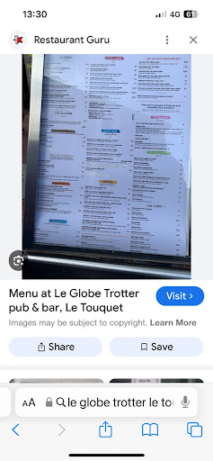 Read moreLe lieu semble sympa et agréable. Encore aurait-il fallu que l'on puisse le découvrir... En vacances, nous ne sommes pas du coin, nous avions cherché sur internet un lieu sympa pour manger un morceau.... Sur le net, la carte du menu laissait à penser que l'on pouvait se restaurer au Globe Trotter... Après nous être installés en terrasse, une serveuse vient (enfin) prendre notre commande. Lorsque nous lui demandons la carte, elle nous répond froidement : "On ne fait pas de restauration ici" et du coup, elle s'en va sans même nous demander si nous voulions au moins boire un verre??? Ok il y avait beaucoup de monde et elle avait probablement beaucoup à faire... Cependant, commercialement ce n'est pas de cette manière que l'on donne une bonne image de l'établissement. Nous nous sommes regardés tous les 3 (ma fille, mon mari et moi) se demandant qu'elle attitude adoptée pour décider rapidement de quitter la terrasse pour la concurrence. Afin d'éviter ce genre de désagréments, il serait donc utile de supprimer la photo du dit "menu" sur le net, voir les commentaires des clients prétendant avoir mangé de très bons burgers chez vous. Vu l'accueil de ce soir, ce qui est certain, c'est que nous choisirons également la concurrence lorsqu'il s'agira de boire un verre en terrasse les semaines à venir... A priori, leur clientèle d'habitués leur suffit. Les touristes ne semblant pas être leur priorité. Dommage car effectivement, le lieu avait...