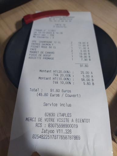 Read moreDe passage sur Ătaples suite au rĂ©cent avis nous avons essayes ce restaurant . Accueil tĂ©lĂ©phonique charmant de la part d Isabelle nous sommes arrivĂ©s un regard froid du gĂ©rant portant une casquette c'est pour ? ... bref nous sommes accueilli et installer par la serveuse tjs aussi sympathique . ApĂ©ro : coupe de champagne prix non indiquĂ© sur la carte . EntrĂ©e saumon : frais et bon. Petit attente car erreur de la cuisine sur la prĂ©sence de salade ... plat viande et canard la cuisson n'est pas optimale pour les deux plats idem aller retour car erreur d assiette vite rĂ©gler par notre serveuse du dĂ©part . Pas de dessert juste cafĂ© le tout pour 90 e pour deux je recommande pour la qualitĂ© du service et la...
